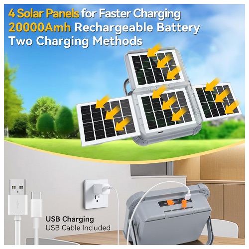 APLICATIVOS: Luz Led portable, 500W, 4 paneles solares de carga y tipo C 5V, salida USB, 3 modos de luz amarilla, blanca, natural